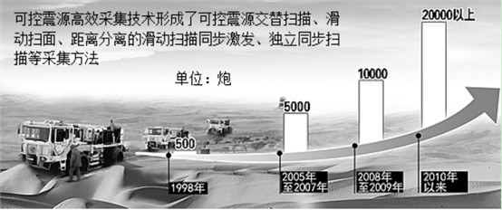 东方物探1998年开始在国外应用可控震源高效采集技术。当年,应用多套震源交替扫描技术,日效最高达到500炮;2005年至2007年,日效最高达到5000炮;2008年至2009年日效达到1万炮以上;2010年以来,日效达到2万炮以上,比1998年提高40倍。