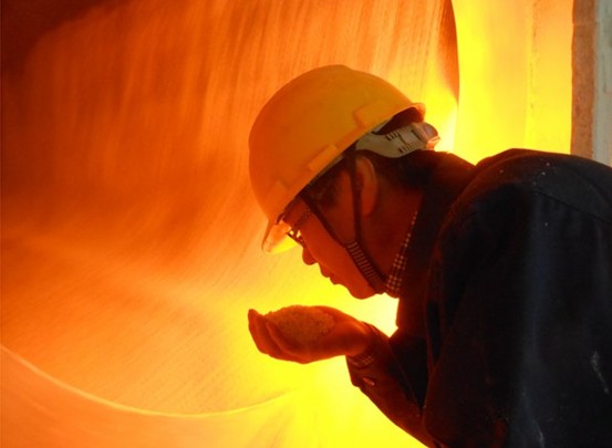 10月30日,中海化学中阿公司,一种新型复合肥防结块剂研发项目进入工业化试验阶段。图为研发工程师宋安新现场检查产品试验效果。