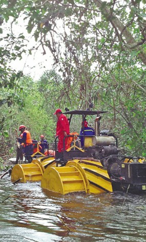 图为在加蓬KARI南部区块勘探项目作业中,东方物探辽河物探处2148队员工用沼泽车清理河道。