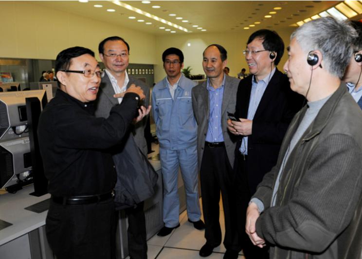 3月29日,中国工程院院士柴天佑、孙优贤、陈丙珍、桂卫华和10多位国内信息工程、智能控制方面的专家、教授,到中国石化镇海炼化分公司调研,研讨有关工业工程控制和智能工厂建设的相关课题。图为专家们在镇海炼化100万吨乙烯中央控制室调研考察。