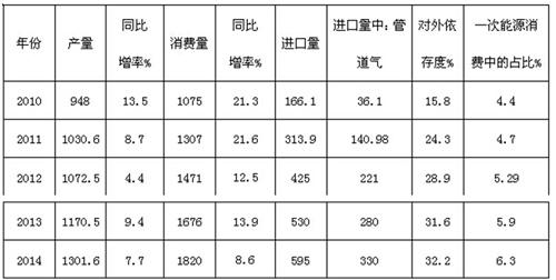 表一:2010-2014我国天然气基本数据(亿立方米)