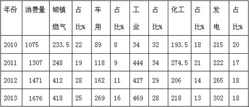 表二:2010-2013年我国天然气消费领域情况(亿立方米)