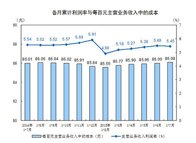 1~7月,规模以上工业企业实现主营业务收入608354亿元,同比增长1.3%;主营业务收入利润率为5.45%,每百元主营业务收入中的成本为86.08元。