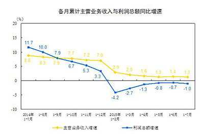 从价格看,工业品出厂价格、原材料购进价格降幅扩大。7月,工业产品出厂价格同比下降5.4%,降幅比6月扩大0.6个百分点;原材料购进价格同比下降6.1%,降幅比6月扩大0.5个百分点。初步测算,因工业品出厂价格下降,工业企业主营业务收入减少5124.6亿元,因原材料购进价格下降,工业企业主营业务成本减少3761亿元,两者相抵,利润净减少1363.6亿元。