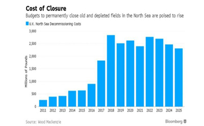 WoodMackenzie公司预计,包括去除离岸钢结构在内的油田关闭支出在截至2025年的近十年期间需花费高达230亿英镑,且2018年的油田关闭预算支出将从今年的8.99亿英镑增长两倍,增至28亿英镑。