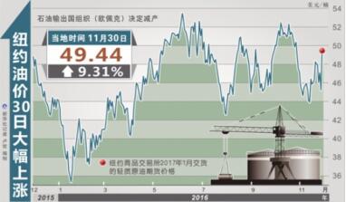 受欧佩克减产协议提振,国际原油市场出现了强劲反弹。截至当天收盘,纽约商品交易所2017年1月交货的轻质原油期货价格上涨4.21美元,收于每桶49.44美元,涨幅为9.31%。2017年1月交货的伦敦布伦特原油期货价格上涨4.09美元,收于每桶50.47美元,涨幅为8.82%。分析人士认为,欧佩克减产的重要意义,除了实际减少产量之外,更重要的是欧佩克为国际原油市场明确了未来一段时间的走势。