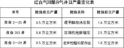 红台采气工区组织技术干部给41口老井排队诊断,给每口井定措施、挖潜力。红台2-25井,实施混甲醇泡沫压裂改造,日产量从0.5万立方米上升到1.6万立方米,从低产井变成高产井。像这样的"潜力井",今年上半年红台工区甄选出3口,实施压裂后口口增产效果明显。