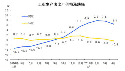 4月工业生产者出厂价格同比上涨6.4%(图)