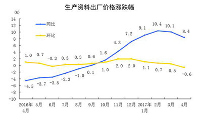 [中国石油新闻中心2017-04-10]2017年4月份,全国工业生产者出厂价格同比上涨6.4%,环比下降0.4%。工业生产者购进价格同比上涨9.0%,环比下降0.3%。1-4月份平均,工业生产者出厂价格同比上涨7.2%,工业生产者购进价格同比上涨9.3%。