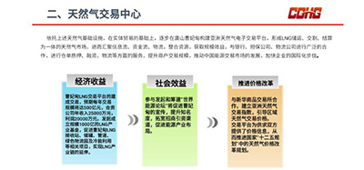 在LNG接收站项目基础上,中海外智慧城市科技集团与曹妃甸金融控股集团,将汇聚信息流、资金流、物流,整合资源,获取规模效益,与银行、担保公司、物流公司进行广泛的合作,进行仓单质押、融资、物流等方面的服务,提升商户交易规模,推动中国能源交易市场的发展,加快企业的国际化步伐,进而建设以曹妃甸为中心的东北亚天然气交易中心。