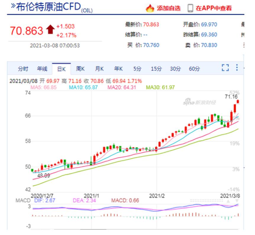 3月8日,布伦特原油期货站上70美元/桶,为去年1月以来首次。WTI原油期货站上67美元/桶,为2018年10月以来首次。