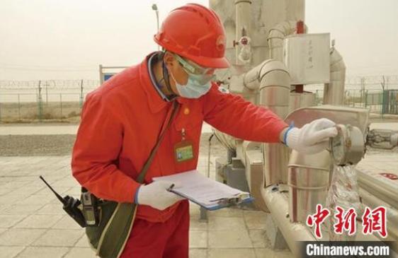 沙尘天气下,塔里木油田迪那油气开发部员工佩戴防护用品进行设备巡检。苏华摄