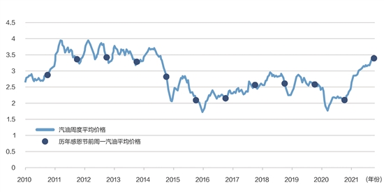 [中国石油新闻中心2021-11-30]据美国能源信息署(EIA)11月24日公布的数据,11月22日,美国汽油平均价格为3.4美元/加仑,比去年同期高1.29美元/加仑(62%),比2019年同期高0.82美元/加仑(32%),是自2012年以来历年感恩节前星期一的最高价格。EIA的数据显示,今年10月,美国汽油价格创1990年以来同比最大涨幅(高达1.13美元/加仑)。原油价格上涨、汽油需求增加以及汽油库存减少导致汽油价格上涨。其中,原油价格是美国汽油价格的主要决定因素,今年10月,原油价格占汽油总成本的57%。11月22日,布伦特原油现货价格比去年感恩节前的星期一上涨73%,比2019年同期上涨25%。