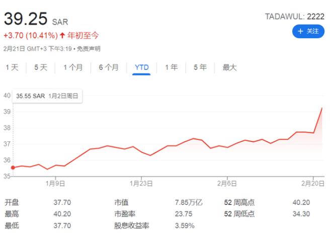 [中国石化新闻网2022-01-22]当地时间2月21日上午开盘后,全球市值最大油企沙特阿美股价一路走高,盘中一度上涨6%。虽然此后股价一度回落,但最终仍收涨4.11%报39.25沙特里亚尔(约合10.45美元),创下2019年12月沙特阿美石油公司上市以来的股价新高,年初至今沙特阿美累计涨幅达10.41%。