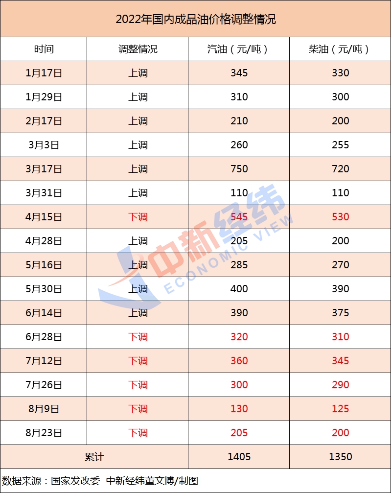据中新经纬梳理,今年以来,国内成品油价格已经进行了16轮调整,呈现“10涨6跌0搁浅”格局,汽油价格累计上调1405元/吨,柴油价格累计上调1350元/吨。