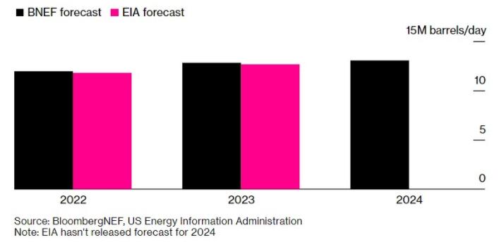 BNEF预计,2024年的日产量将增加不到20万桶,达到1304万桶。预计到2024年底,二叠纪盆地的石油产量将达到580万桶/天。