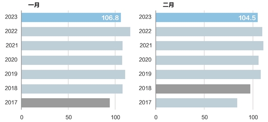 美国天然气消费(1—2月,2017—2023年)十亿立方英尺/日
