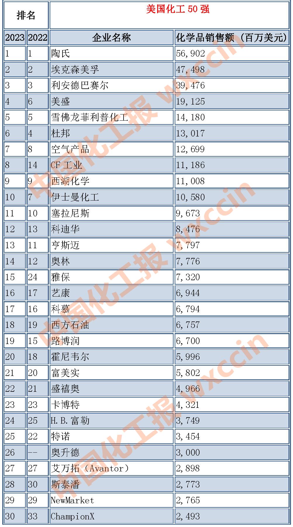 [中化新网时2023-05-17]中化新网讯近日,美国《化学与工程新闻》基于2022年财务业绩,公布了2023年美国化工企业50强报告。其中,陶氏、埃克森美孚、利安德巴赛尔占据前三名。报告显示,2022年美国前50名化学品生产商的销售额合计为3767亿美元,较上一年增长11.4%,创下该年度调查的新纪录。
