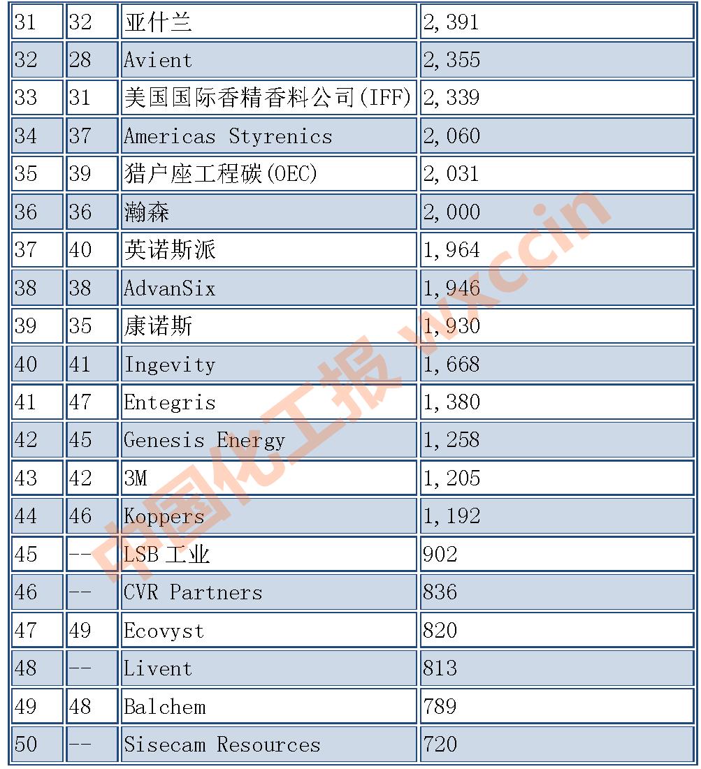 《化学与工程新闻》表示,该排名仅针对公开报告化学品销售业绩的公司,因此,一些在化工领域有业务,但未单独披露相关业绩的企业并未上榜,如英威达和宝洁。(中国化工报饶兴鹤)