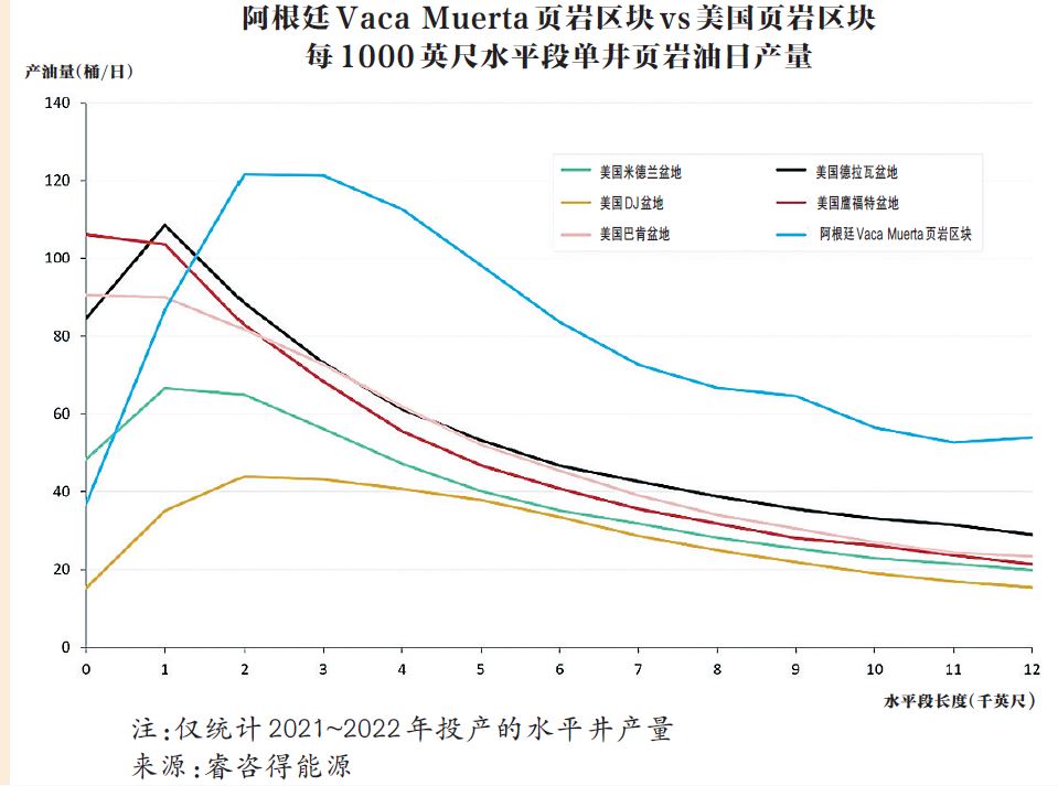 尽管业内对VacaMuerta页岩区块产量能否真正实现长期增长仍存在担忧,但该区块具备大规模油气生产能力且页岩油的质量较好是毋庸置疑的。其页岩的特点是压力高、厚度大,单位英尺产油量明显优于美国主要页岩油产地的同类型水平井。