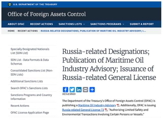 [中国石化新闻网2023-10-16]10月12日,因以超过G7集团上限价格运输俄罗斯石油,两家油轮船东及两艘船舶遭到美国制裁。