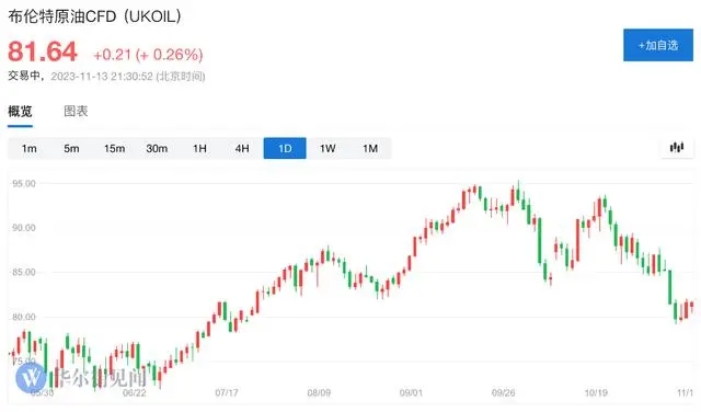 巴以冲突爆发后,由于担心冲突会影响更广泛的中东地区,油价飙升,布伦特原油于10月19日达到每桶92.38美元的峰值。此后价格下跌,现报每桶81.64美元。