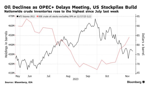 [国际石油网2023-11-28]由于欧佩克+产油国意外推迟会议,引发了对全球原油供应的质疑,国际油价在周三的动荡中收跌近1%,周四延续跌势。