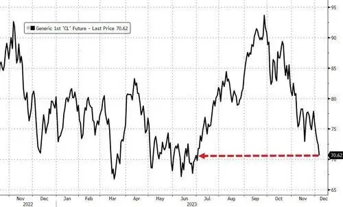 WTI原油日内跌幅达4%,报69.42美元/桶,刷新五个月新低。布伦特原油盘中跌幅也达到3.5%。这是OPEC+宣布最新一轮扩大减产后,连续第五个交易日下跌。此外,美国零售汽油价格在假日购物和旅游季之前,触及今年1月份以来的最低点。