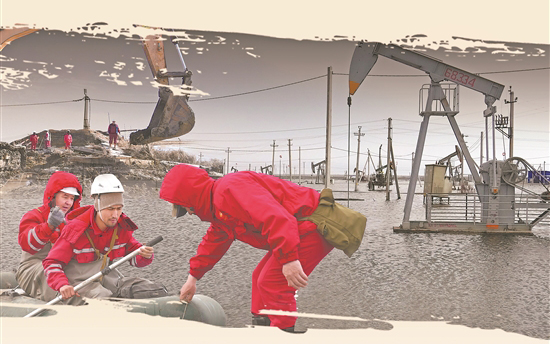 刚刚回国休假的肯基亚克采油厂厂长高金强,闻讯迅速结束休假计划返回油田岗位。他说:“4月1日回到油区时,看到漫天洪水侵袭油区,既震惊又有对油田复产的焦虑。我们按照公司的整体安排,对油田和设备采取了紧急措施。”众志成城?阻击洪涛骇浪