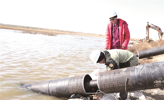 4月13日,阿克纠宾公司员工焊补排水管。李春辉 摄