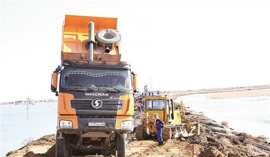 4月13日,阿克纠宾公司动用特型车加固堤岸。李春辉 摄