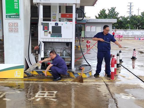 7月13日,湖北孝感遇强降雨天气。湖北孝感石油第一时间启动应急预案,组织救援突击队,赶赴受灾严重的加能站现场全力排涝,化解安全风险,保障油品安全供应。图为当日救援突击队员在安陆安然油气合建站清理抽排站内积水。黄曙端摄仰慕菡文