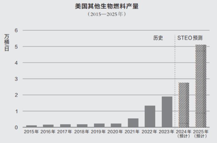 EIA的《石油供应月刊》显示,除SAF外,美国还生产其他生物燃料,如可再生取暖油、可再生石脑油、可再生丙烷和可再生汽油等。尽管目前SAF产量仅占生物燃料产量的一小部分,但随着生产能力的提高,其份额预计将显著增加。根据EIA最新发布的短期能源展望(STEO),美国其他生物燃料的总产能预计从2023年的1.9万桶/日增至2025年的5.1万桶/日。