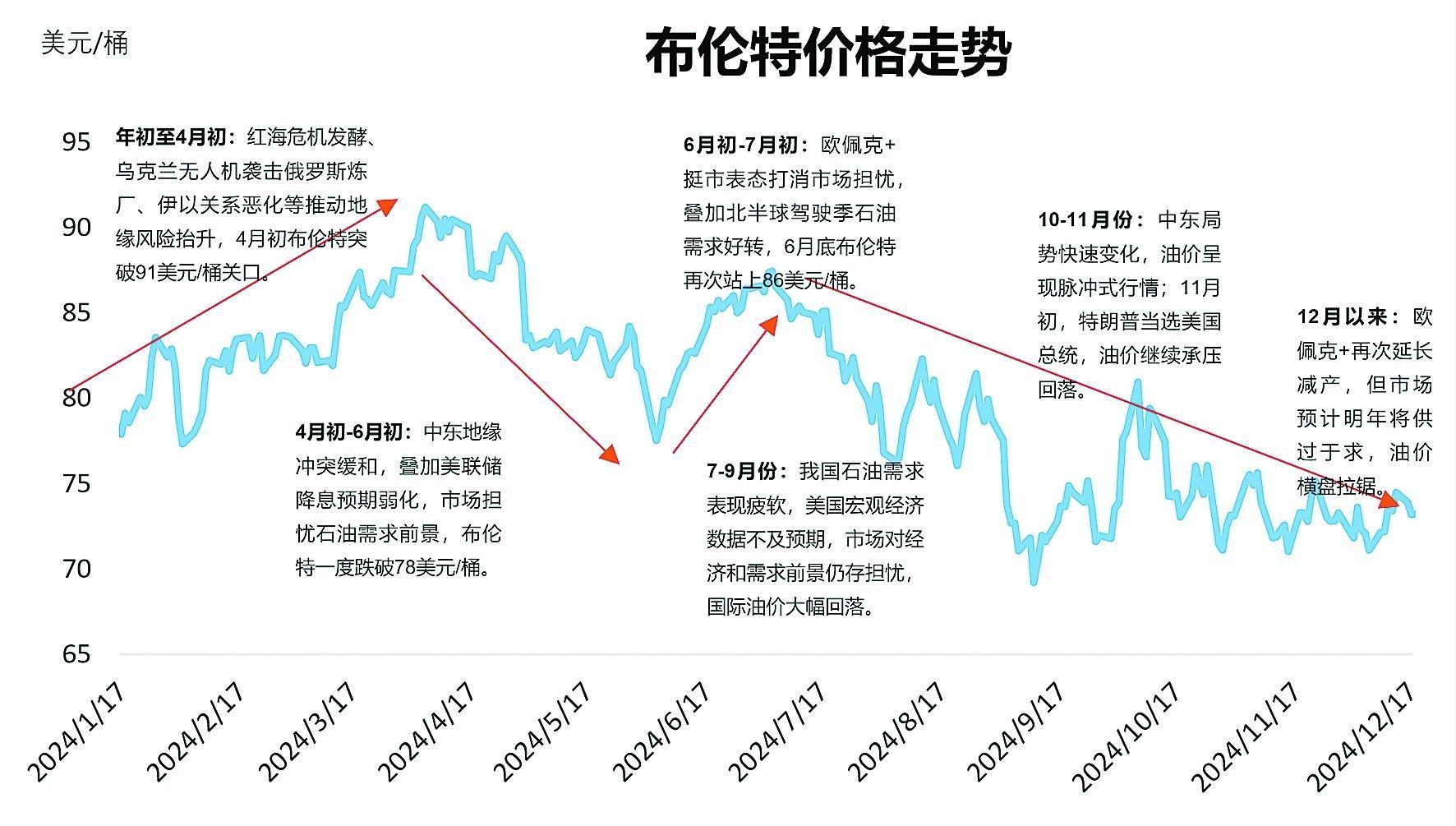 [中国石化报 2025-01-20]地缘政治风险决定油价高度。2024年是地缘政治动荡与转折的一年,中东局势波谲云诡对油价造成脉冲式影响。巴以战争持续升级、胡塞武装袭击红海航线、伊朗与以色列相互打击报复、叙利亚政权颠覆等地缘政治事件此消彼长,抬升了地缘风险,并支撑国际油价阶段性飙升。2024年4月初,因市场担心伊朗与以色列发生战争,布伦特原油价格一度突破91美元/桶,锚定全年高点。
