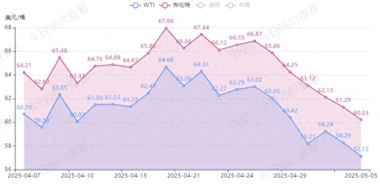 把目光转向国际市场,上周的油价走势可谓是惊心动魄,跌宕起伏。在持续上涨之后,五一假期期间,国际原油价格却突然大幅下跌,累计跌幅超 3.1%,这一跌势直接让国际原油双双失守 65 美元大关。截至目前,美原油价格下跌至 57.19 美元 / 桶,布伦特原油也下滑至 60.31 美元 / 桶 。4 月油价的大幅波动,似乎为 5 月油价大跌埋下了伏笔。