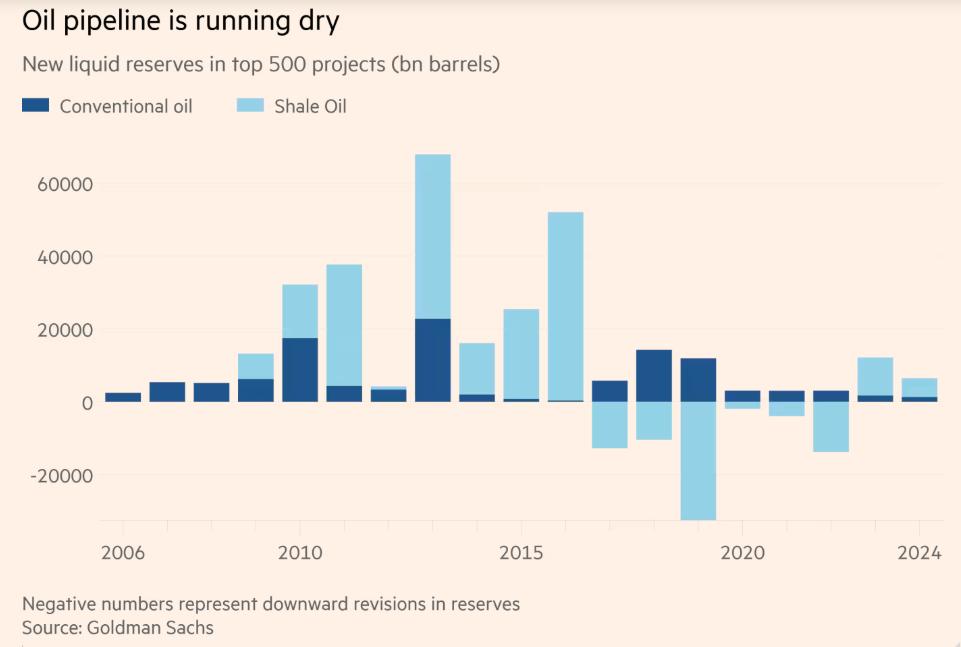 但OPEC或许无需忍受太久阵痛。埃克森美孚、壳牌、BP等非OPEC巨头近年新发现油田寥寥。高盛对行业顶级项目的分析显示,过去五年非页岩油田年均发现量仅25亿桶,不足前三年的四分之一。