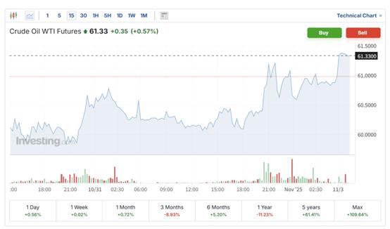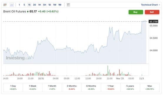 由于市场担心供应过剩,油价在10月20日跌至每桶约60美元的五个月低点,但此后受俄罗斯制裁以及对美国与贸易伙伴谈判的乐观情绪提振,油价回升至每桶约65美元。