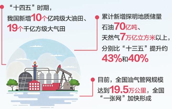 “十四五”期间,我国石油天然气勘探成果丰硕,产量稳中有增,推动我国油气生产进入量效齐增与绿色开发新阶段。我国新增10个亿吨级大油田、19个千亿方级大气田。累计新增探明地质储量石油70亿吨、天然气7万亿立方米以上,分别比“十三五”提升约43%和40%。目前,全国油气管网规模达到19.5万公里,全国“一张网”加快形成。