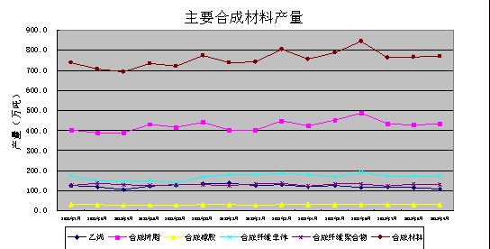 生产合成材料769万吨,同比增长3.3%。其中,合成树脂433万吨,同比增长2.7%;合成橡胶32.7万吨,同比增长19.2%;合成纤维单体171万吨,同比增长0.3%;合成纤维聚合物产量132万吨,同比增长5.6%。
