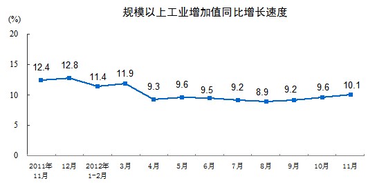 [国家统计局2012-12-10]2012年11月份,规模以上工业增加值同比实际增长10.1%(以下增加值增速均为扣除价格因素的实际增长率),比10月份加快0.5个百分点。从环比看,11月份,规模以上工业增加值比上月增长0.86%。1-11月份,规模以上工业增加值同比增长10.0%。