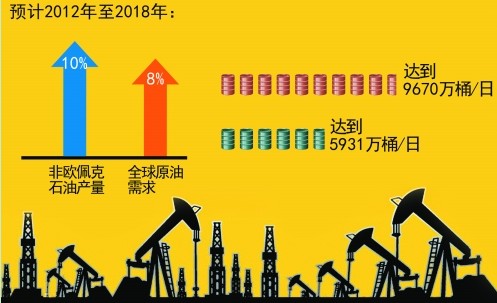 据中国新闻网报道国际能源署(IEA)5月4日发布的报告预测,由于美国页岩油产量的上升,石油市场正遭受积极的供给冲击。北美正在持续以创纪录的速度生产石油。IEA预计,2012年至2018年,美国每天原油产量增加390万桶,成为石油净出口国。预计2012年至2018年,全球原油需求上升8%,达到9670万桶/日。新增石油需求主要由非欧佩克国家来满足,预计2012年至2018年间,非欧佩克石油产量增长超过10%,达到5931万桶/日。