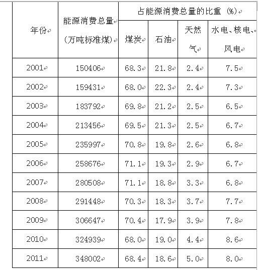 [中国石化新闻网2013-05-24]据国家统计局公布的数据显示,我国2012年全年能源消费总量为36.2亿吨标准煤,比上年增长3.9%。其中,年煤炭消费量比上年增长2.5%;原油消费量增长6.0%;天然气消费量增长10.2%;电力消费量增长5.5%。下表为2001-2011年我国能源消费总量及构成:
