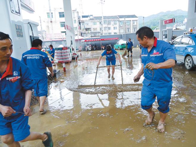 一夜暴雨之后,贵州铜仁石油石阡大桥加油站员工在站内排水。