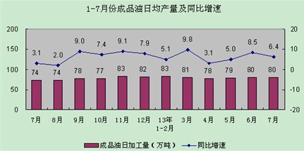 从单月来看,7月份原油加工量4030万吨,同比增长7.1%,环比增长1.8%;成品油产量2478万吨,同比增长6.4%,环比增长3.3%;乙烯产量132万吨,同比增长10.3%,环比增长0.6%;合成树脂产量480万吨、合成橡胶产量34万吨,同比增长9.7%、7.3%,环比下降3.2%、2.8%;化肥产量645万吨,同比下降1.4%,环比下降8.4%。
