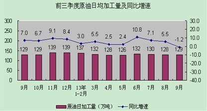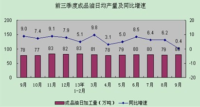 受国内成品油市场需求低迷及同期基数较高影响,9月份原油日均加工量和成品油产量同比增速较前三季度分别低5.4和5.6个百分点;与8月份相比,同比增速分别下滑6.7和5.8个百分点。