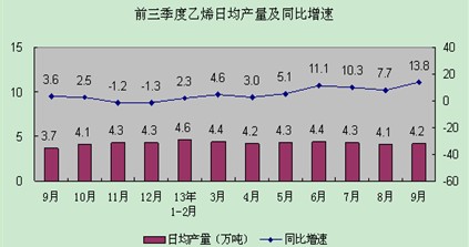 产量。前三季度,主要石化产品产量稳步增长。原油加工量35579万吨、成品油产量21986万吨、乙烯产量1179万吨,同比增长4.2%、5.2%、6.4%;合成树脂产量4292万吨、合成橡胶产量301万吨,同比增长10.3%、6.3%;化肥产量6046万吨(折纯,下同),同比增长6.1%。