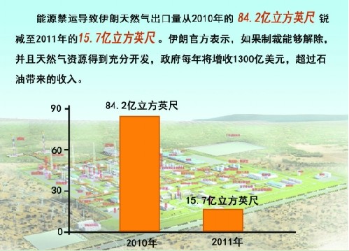 能源禁运导致伊朗天然气出口量从2010年的84.2亿立方英尺锐减至2011年的15.7亿立方英尺(1立方英尺≈0.028立方米)。伊朗官方表示,如果制裁能够解除,并且天然气资源得到充分开发,政府每年将增收1300亿美元,超过石油带来的收入。