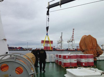 8月7日中午,在澳大利亚珀斯的福利曼特尔港口(FREMANTLE),执行马航MH370搜救任务的上海海事局“海巡01”轮顺利完成SINOPEC船用中速机油的补给工作。