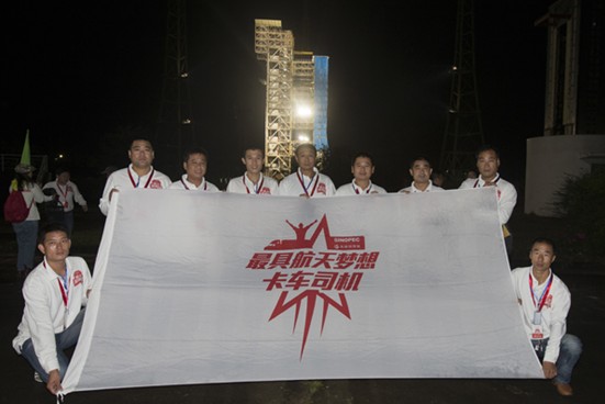 在即将发射北斗导航卫星的火箭发射架下,长城润滑油中国航天助威团团员们纷纷拍照留念。图为在长城尊龙产品全国路演活动中评选出的九名"最具航天梦想的卡车司机"以合影的形式纪念本次在西昌难忘的航天之旅。付增凯摄