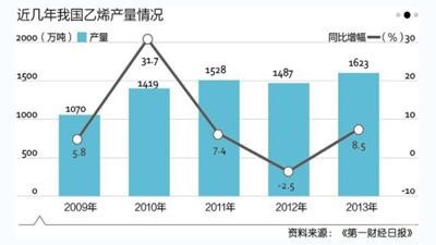 尽管市场需求大,但国内乙烯行业却产能过剩,遭遇寒流。2008年以来国内乙烯生产企业普遍出现产品滞销、库存大量增加、经营亏损的现象。2012年后形势越发严峻,全国近一半的乙烯装置采取了停工检修的手段避免亏损扩大。